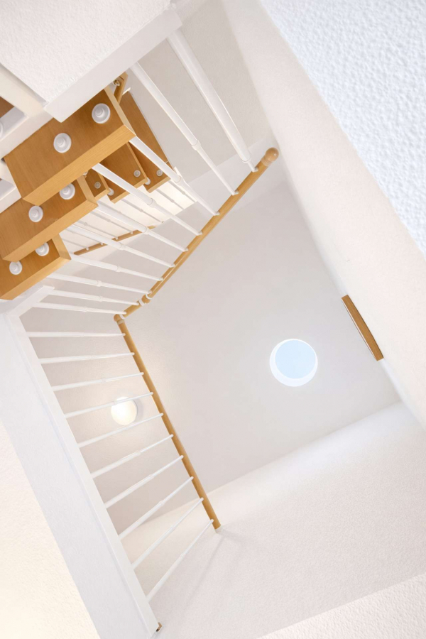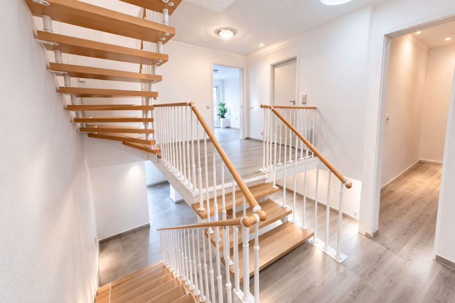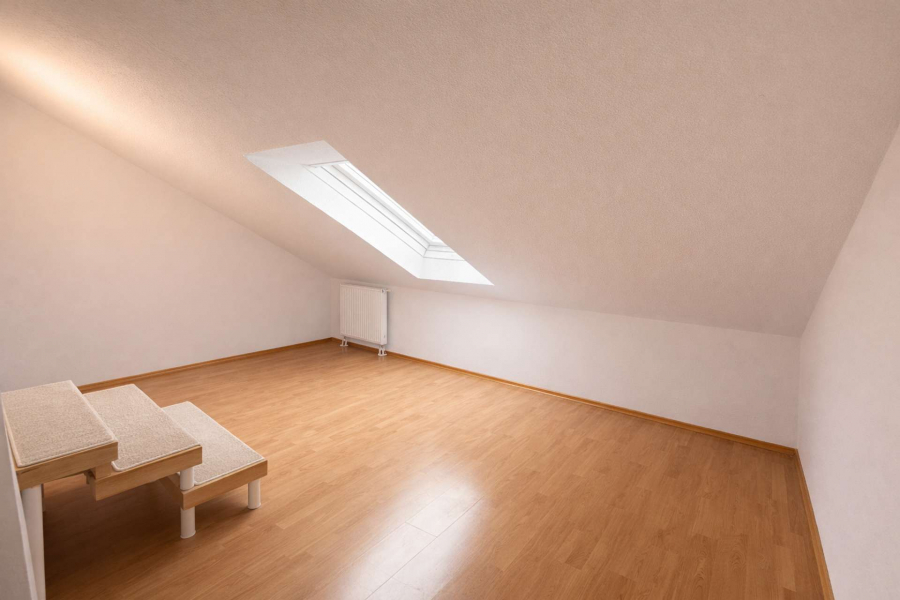 Über die charakteristischen Split-Level-Zwischenebenen erreicht man die privaten Räume im Obergeschoss sowie das ausgebaute Dachstudio mit zusätzlichem Duschbad. Diese Ebene eignet sich ideal als Arbeits-, Gäste- oder Jugendbereich.